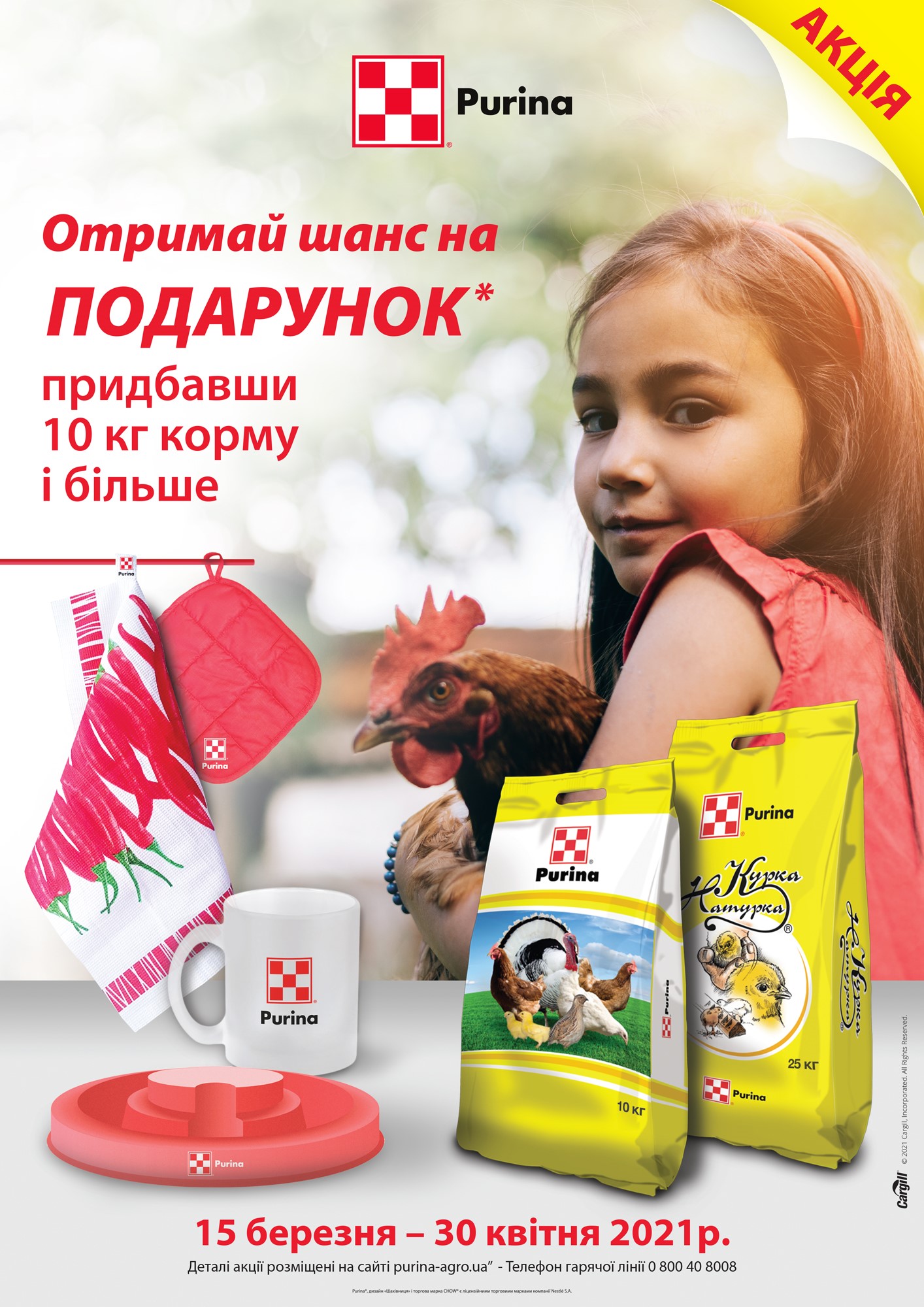 В період з 15 березня 2021 р. до 30 квітня 2021 р. в торгових точках зазначених в правилах акції, придбавши 10 кг і більше пташинного корму Purina®, Ви маєте шанс отримати один з чотирьох подарунків.