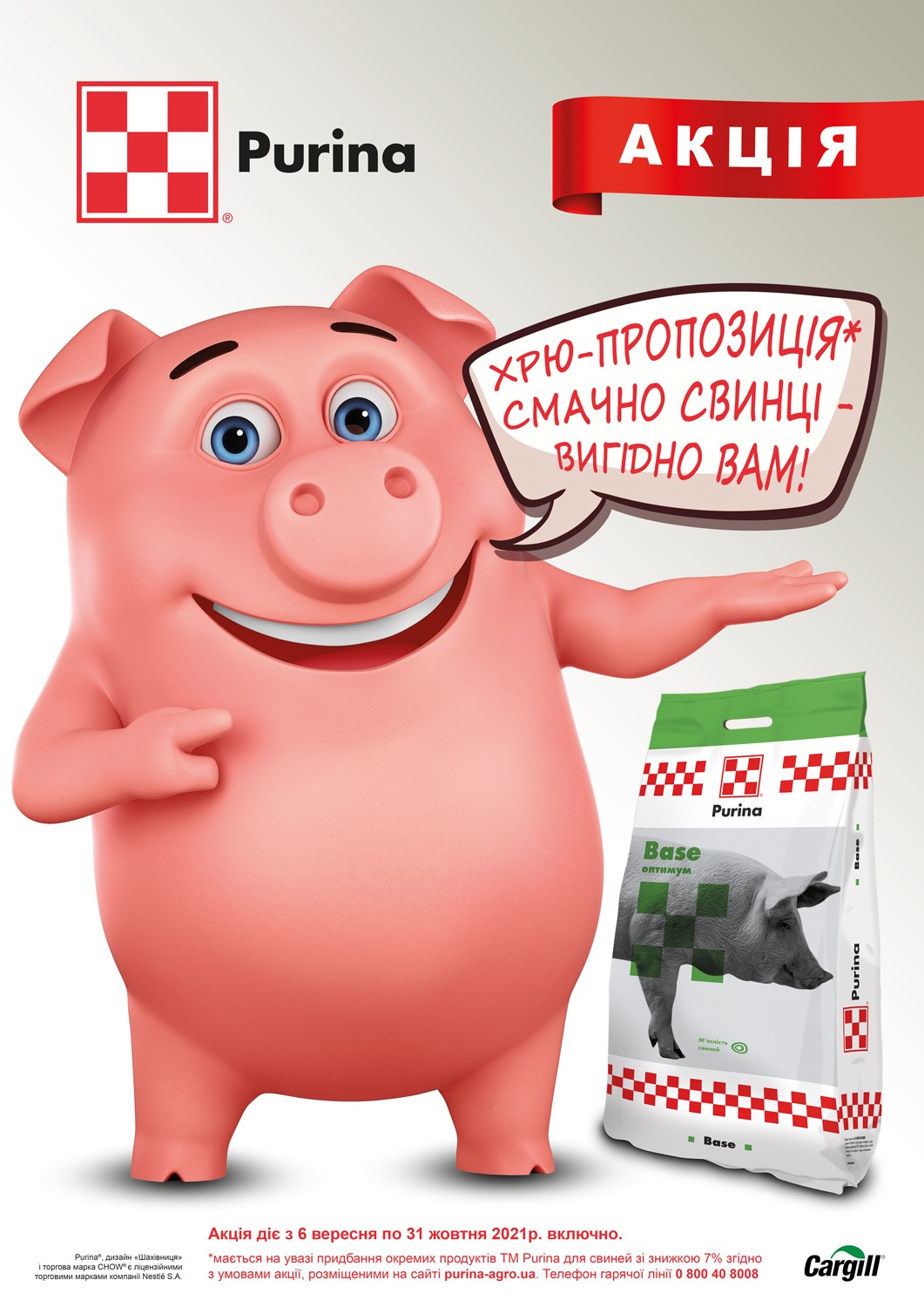 В період з 06 вересня 2021 р. по 31 жовтня 2021 р. в торгових точках, де продається продукція TM Purina, Ви маєте можливість придбати акційні продукти ТМ Purina для свиней зі знижкою.