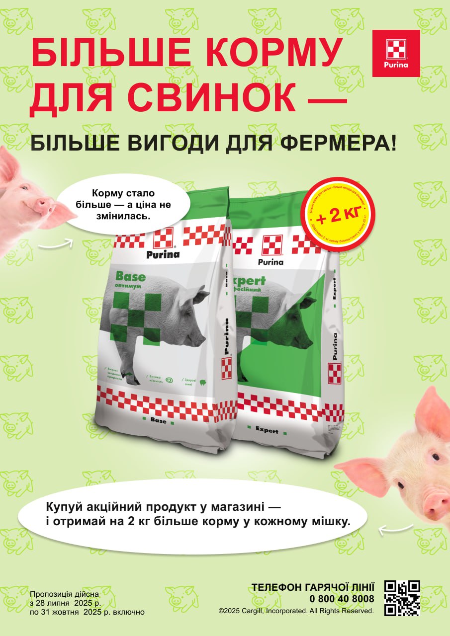 Концентрати для свиней Purina доступні в упаковках 27 кг за ціною 25 кг!